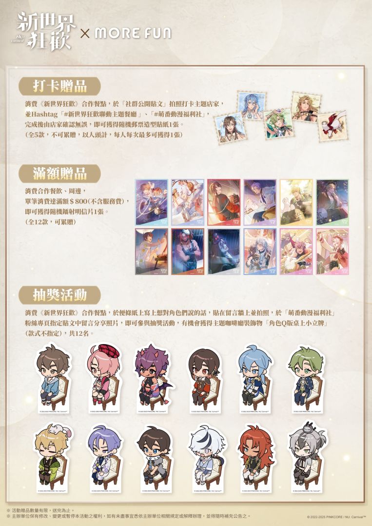 消費《新世界狂歡》合作餐點,與店內主題裝飾物拍照並公開分享至社群媒體,貼文內容需打卡主題店家,並 Hashtag「#新世界狂歡聯動主題餐廳」、「#萌番動漫福利社」,即可獲得隨機郵票造型貼紙1張。(全5款,不可累贈,以人頭計,每人每次最多可獲得1張。)
