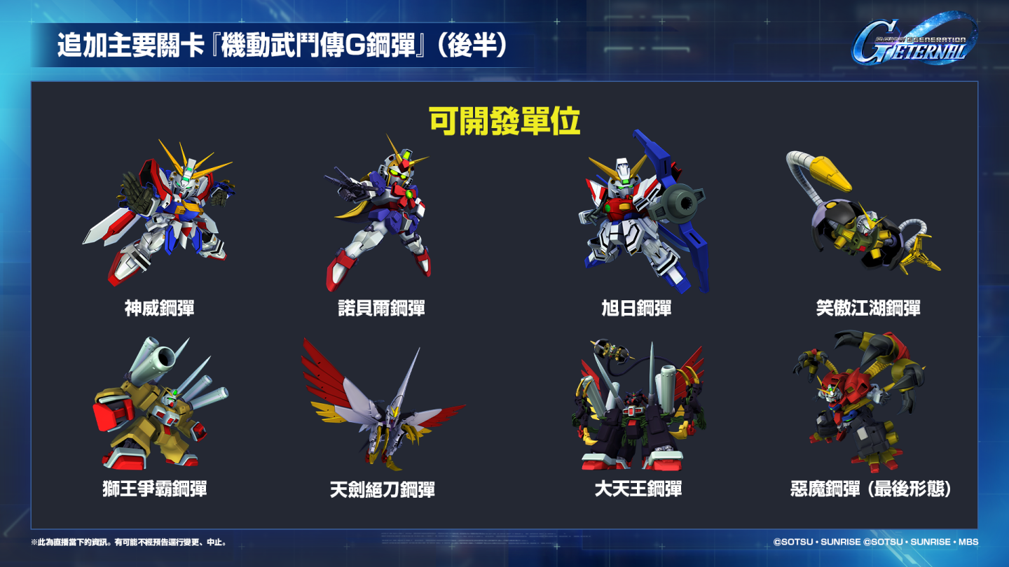 追加主要關卡「機動戰士鋼彈UC〔獨角獸〕」、「機動武鬥傳G鋼彈」(後半)!