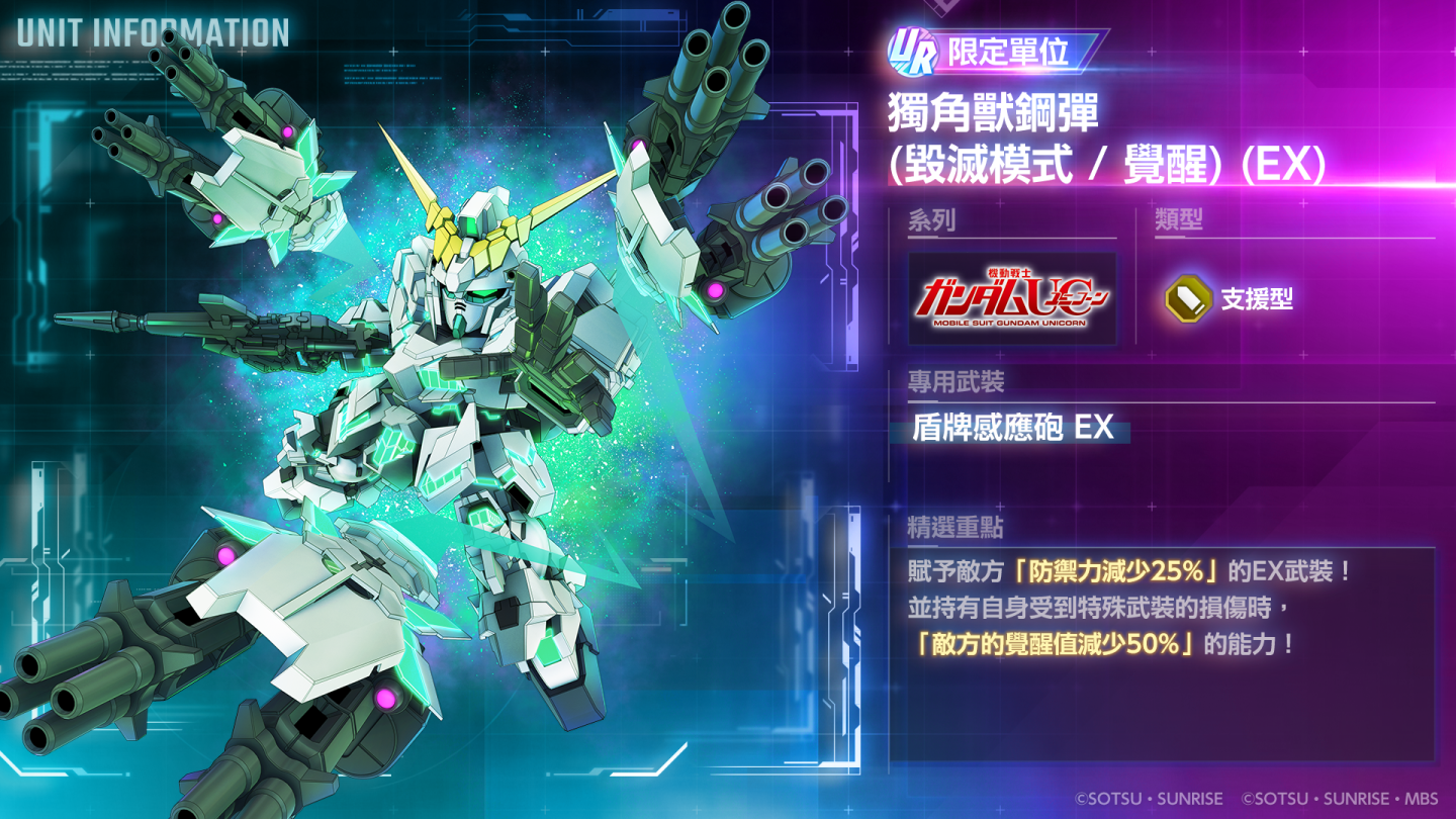 限期登場單位 UR「獨角獸鋼彈(毀滅模式/覺醒)(EX)」/UR「巴納吉.林克斯」、UR「神威鋼彈(EX)」/UR「多門.火州」,以及限期登場 UR 支援人員「奧特.米塔斯&擬.阿卡瑪(隆德.貝爾)」於精選機體補給中登場!