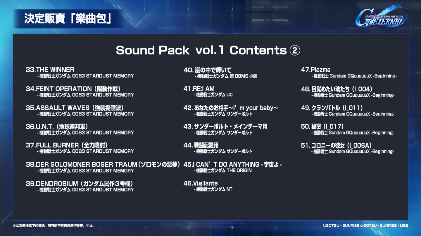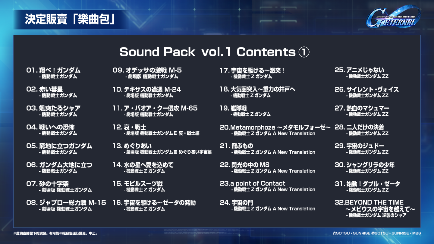 收錄了可在遊戲內聆聽的各首樂曲,「樂曲包 vol.1」已於 9 月 30 日開始販售!樂曲包中包含了 51 首 BGM,以及高級機體補給券。購買並解放 BGM 後,便可在遊戲內的「BGM 設定」中更改要播放的 BGM。獲得您喜愛的 BGM,在動人的樂聲下暢遊《G世代 永恆》吧!