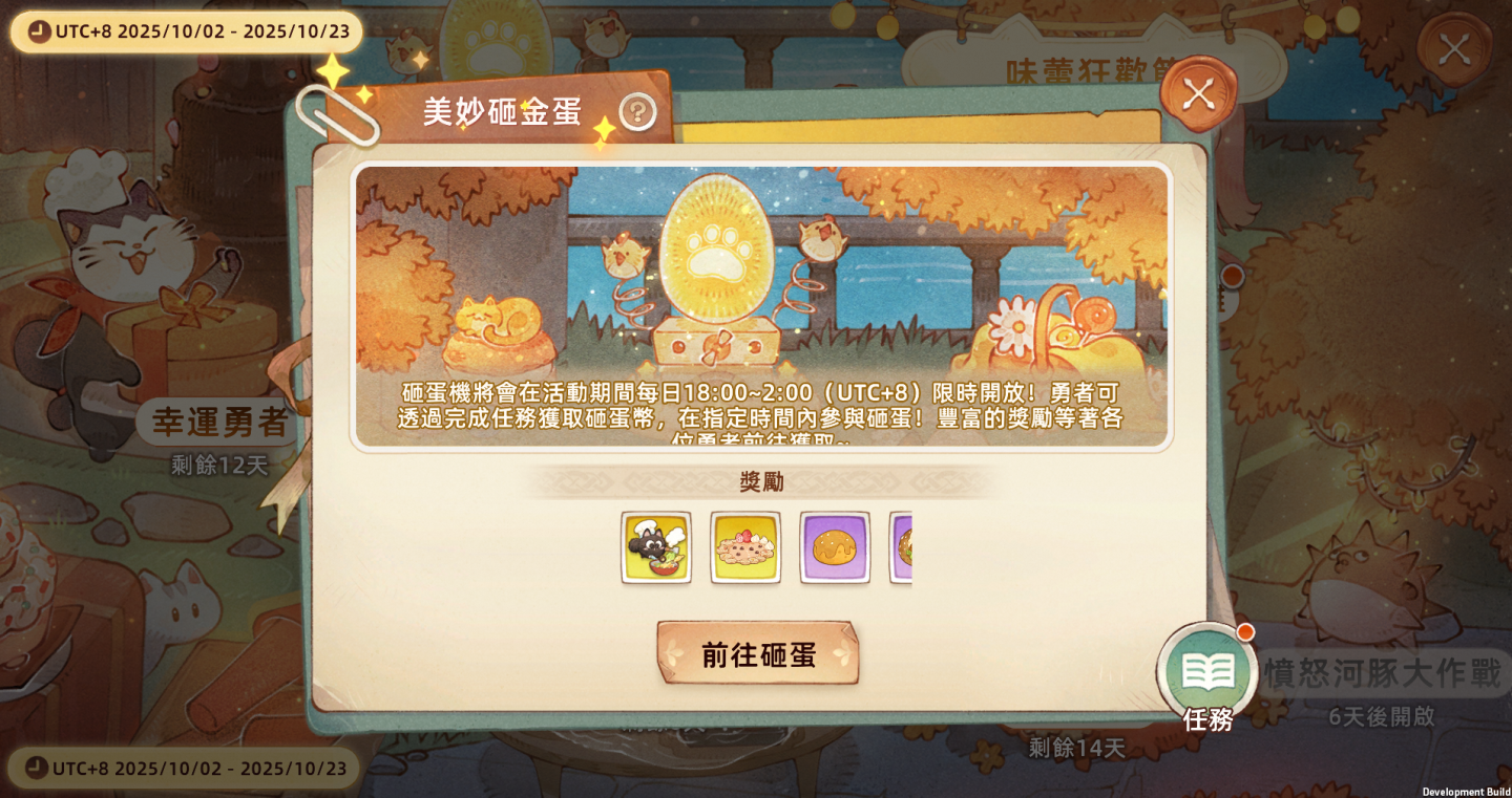 「美妙砸金蛋」活動同步開啟,勇者消耗砸蛋幣進行砸蛋,可免費獲取「漢堡沙發」、「珍珠奶茶溫泉」等限定美食主題家具,以及「毛球大廚」背飾、秘器之心寶箱、福袋禮券等驚喜好禮。