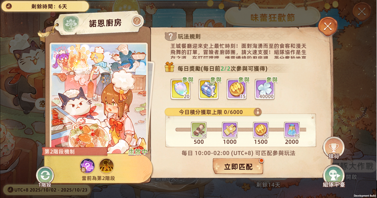 「諾恩廚房」則需要勇者組隊合作,根據條件要求對食材進行加工烹飪,在規定時間內提交餐點獲得積分,積分較高的一方可以獲得喵喵大表情、扭蛋幣、女神碎金等勝利獎勵。