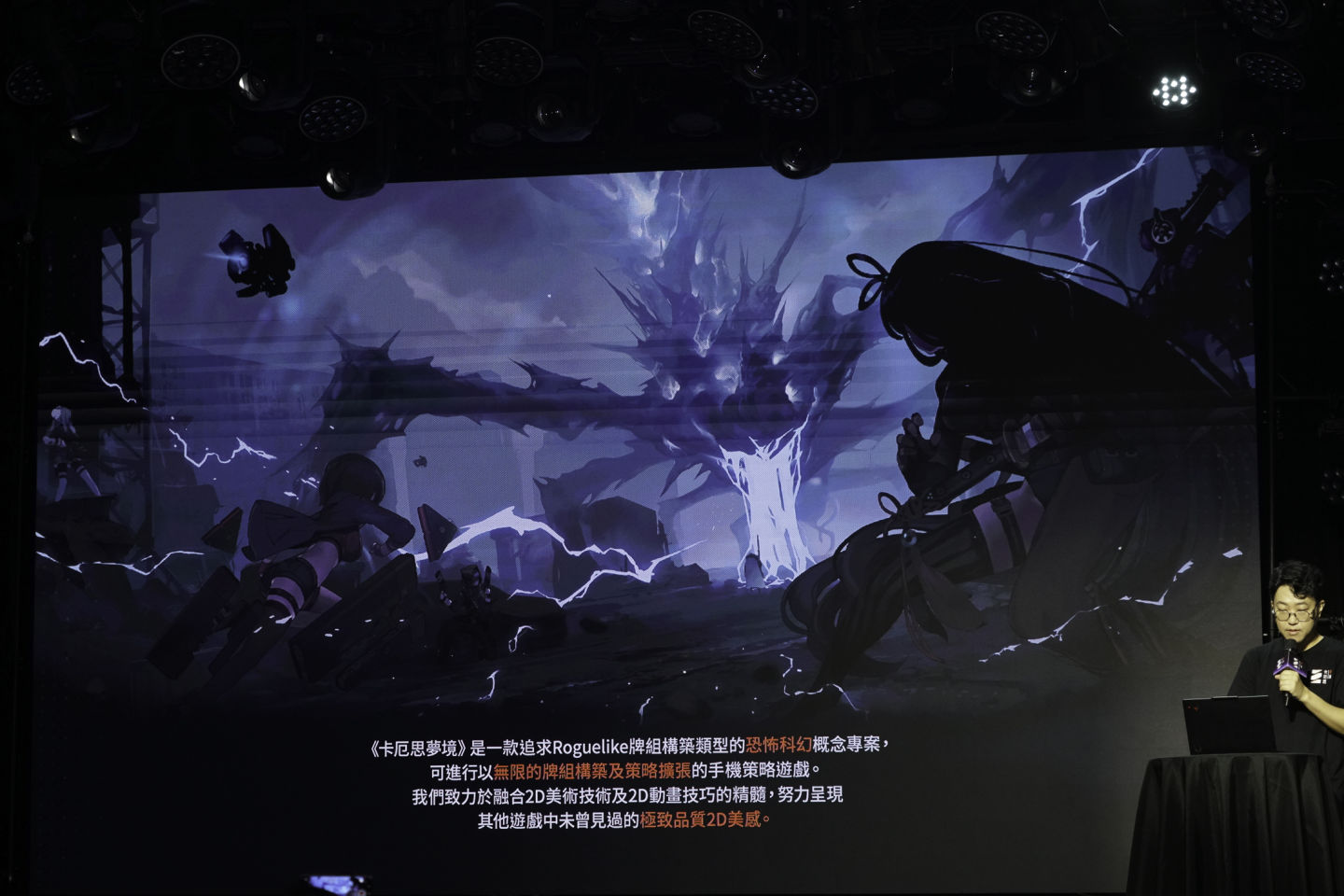 SUPER CREATIVE 遊戲總監上台首先感謝台灣玩家對於《第七史詩》的喜愛,並未玩家介紹《卡厄思夢境》的特色及設計理念,他將《卡厄思夢境》定義為一款融合「Roguelike牌組構築」、「恐怖」與「科幻」元素的獨特作品。核心特色是「近乎無限的牌組構築」以及「極致的 2D 美術表現」,以此挑戰收集型角色 RPG 的市場。