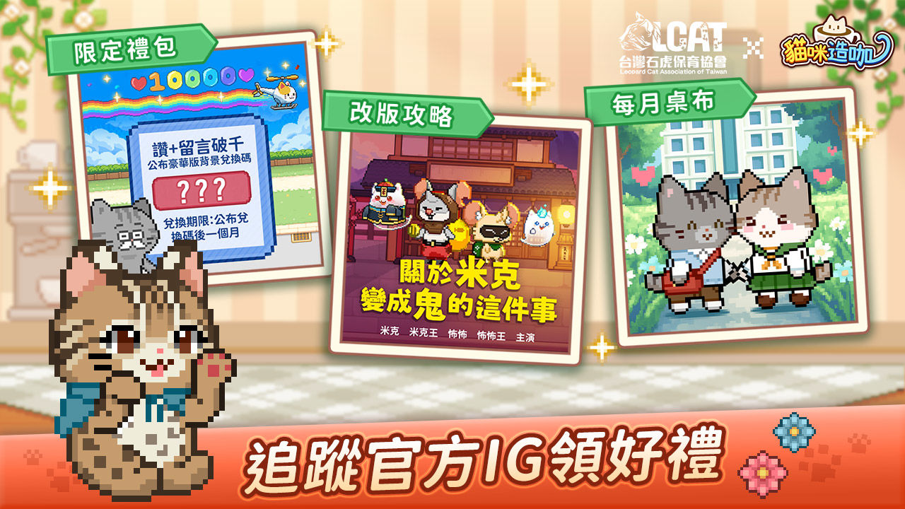 《貓咪造咖》官方 IG 不定期發出虛寶兌換碼,升級必備的食譜、小魚乾、喵鑽等你來領取!還有社群限定抽獎活動,有機會獲得超稀有的特殊花色貓咪!快到 IG 按下追蹤,不錯過任何貓貓限定好康喵!