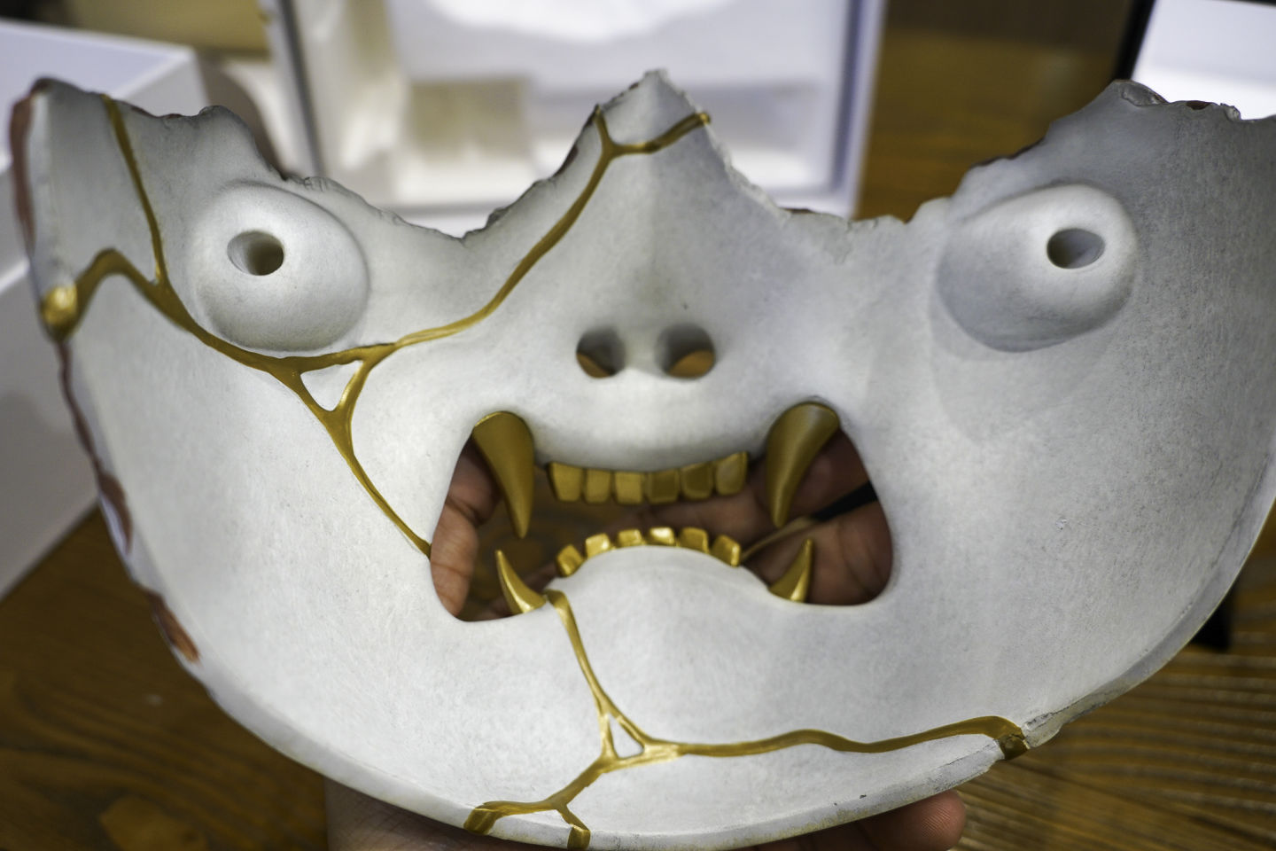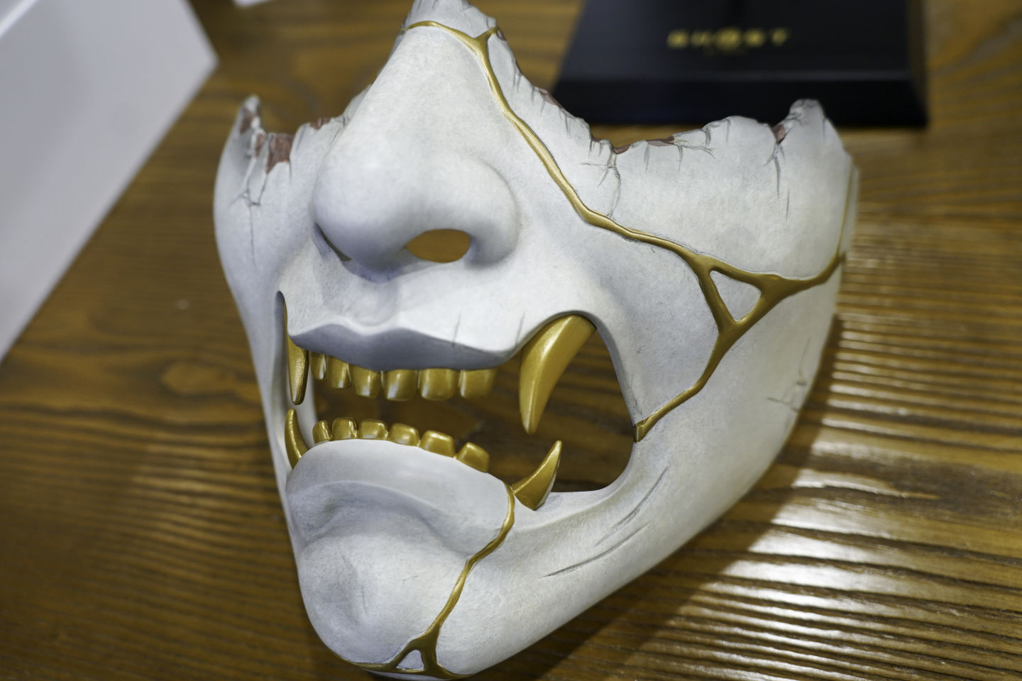 主要就是本次佔據體積最大,以 1:1 打造主角篤配戴的「戰鬼面具」,可惜是拿來擺設用的支架,並沒有規劃設計給玩家想要配戴著玩的沈浸感需求,但做工相當精緻,拿起來也非常有「重量感」。