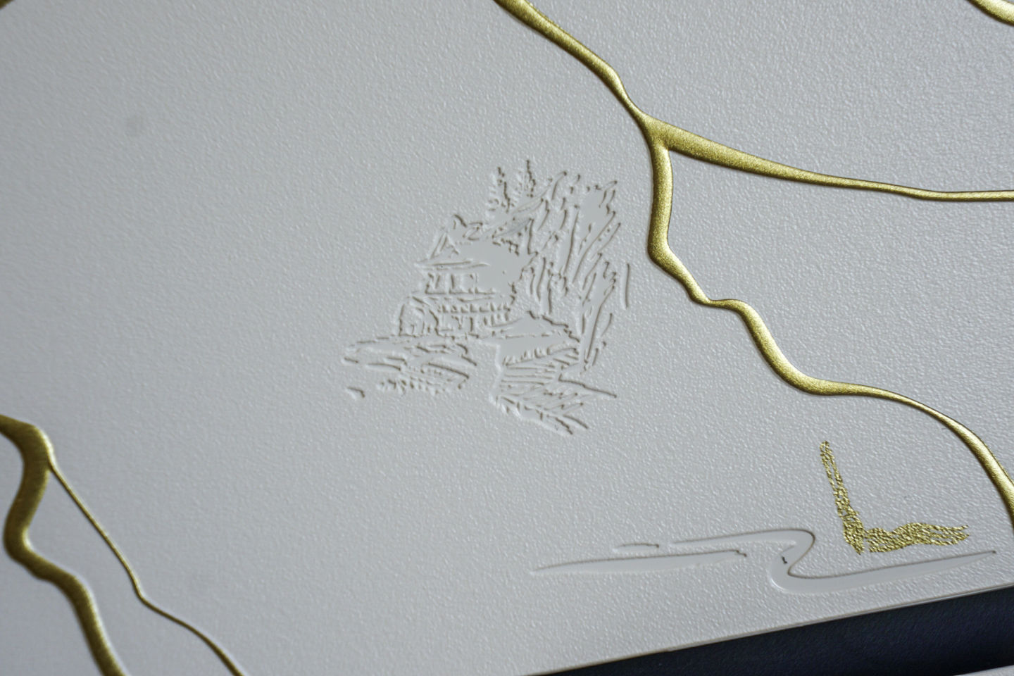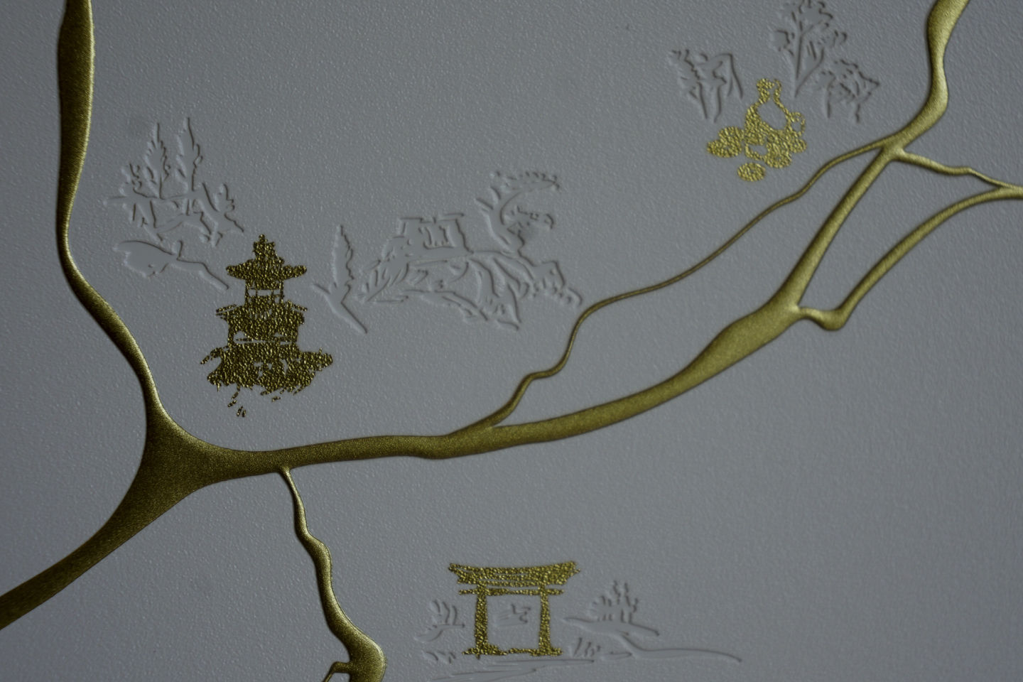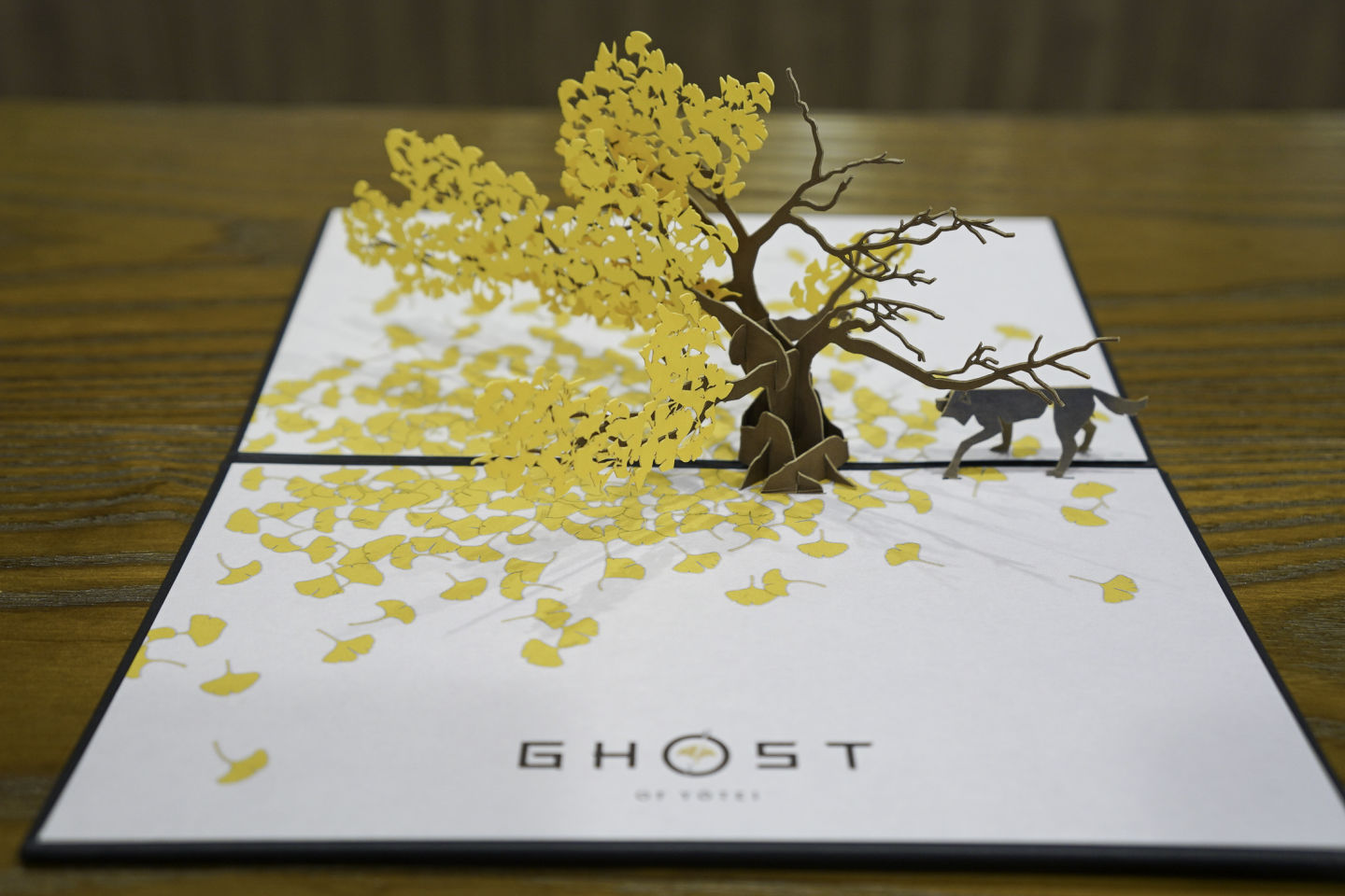 銀杏樹紙藝卡,用紙雕呈現金色杏葉地毯和紙樹,一旁的狼元素,看得出整體氣氛傳達了開發團隊熱愛「和風」淒美的風景。