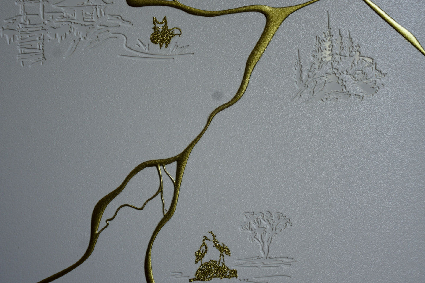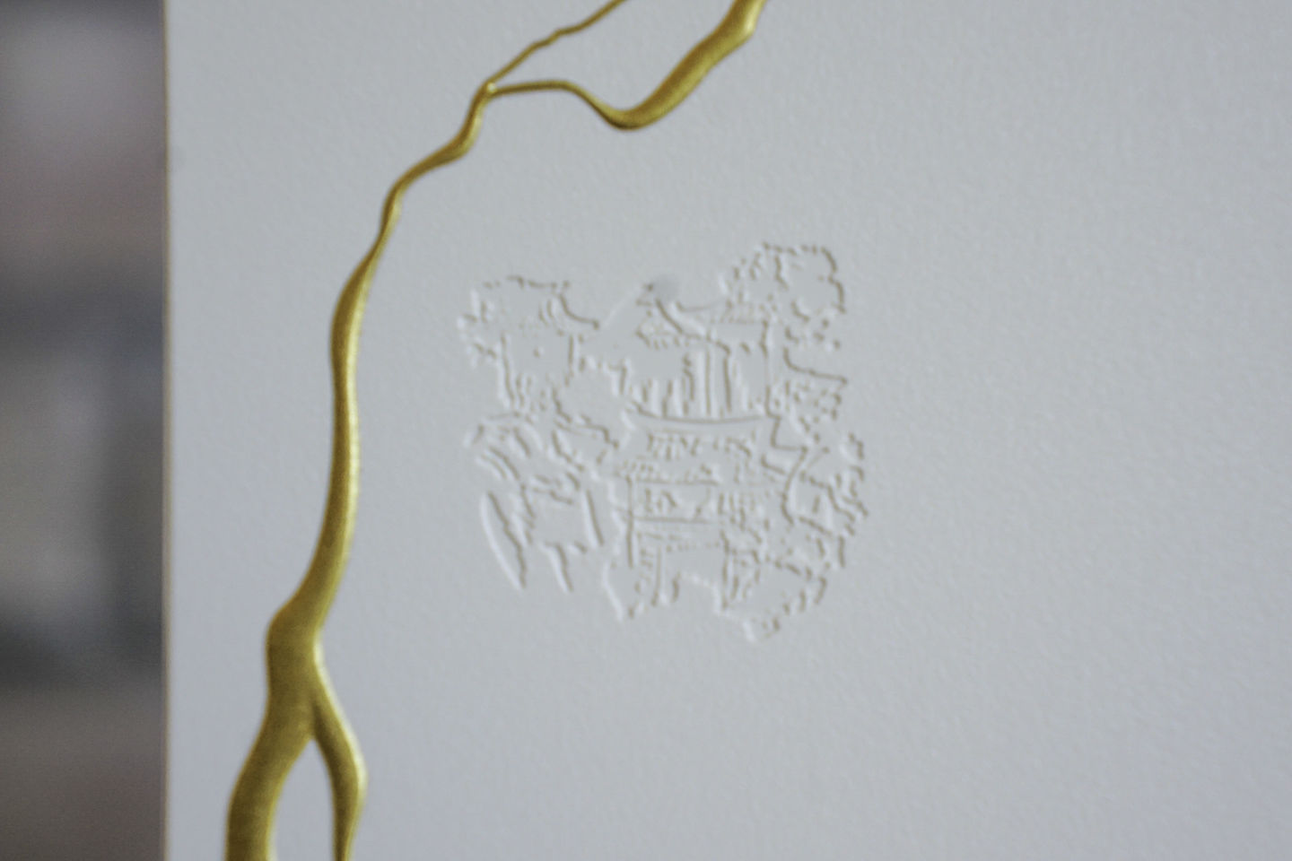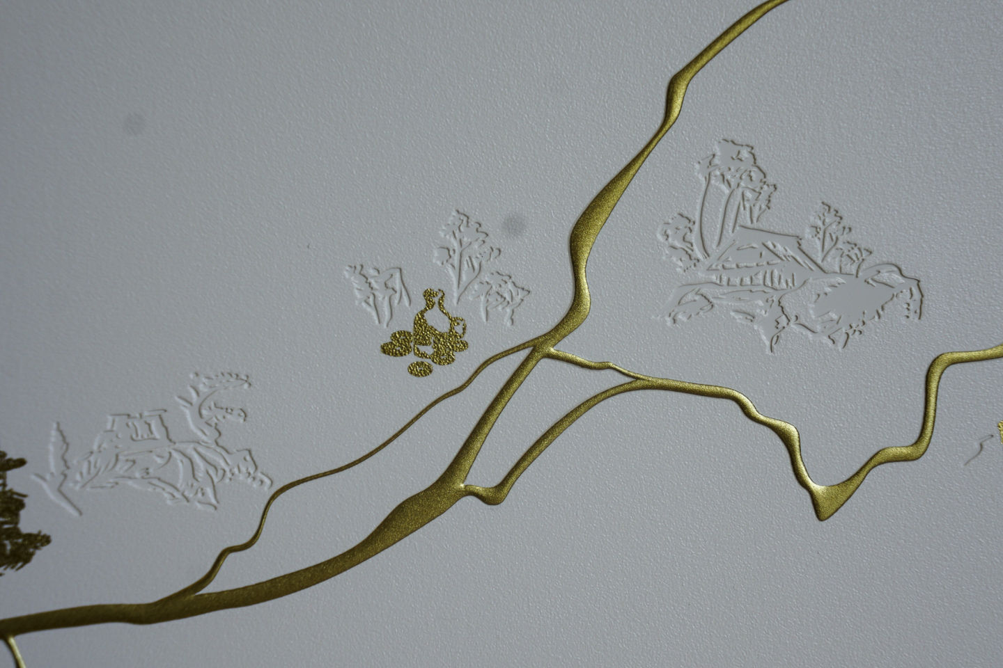 銀杏樹紙藝卡,用紙雕呈現金色杏葉地毯和紙樹,一旁的狼元素,看得出整體氣氛傳達了開發團隊熱愛「和風」淒美的風景。