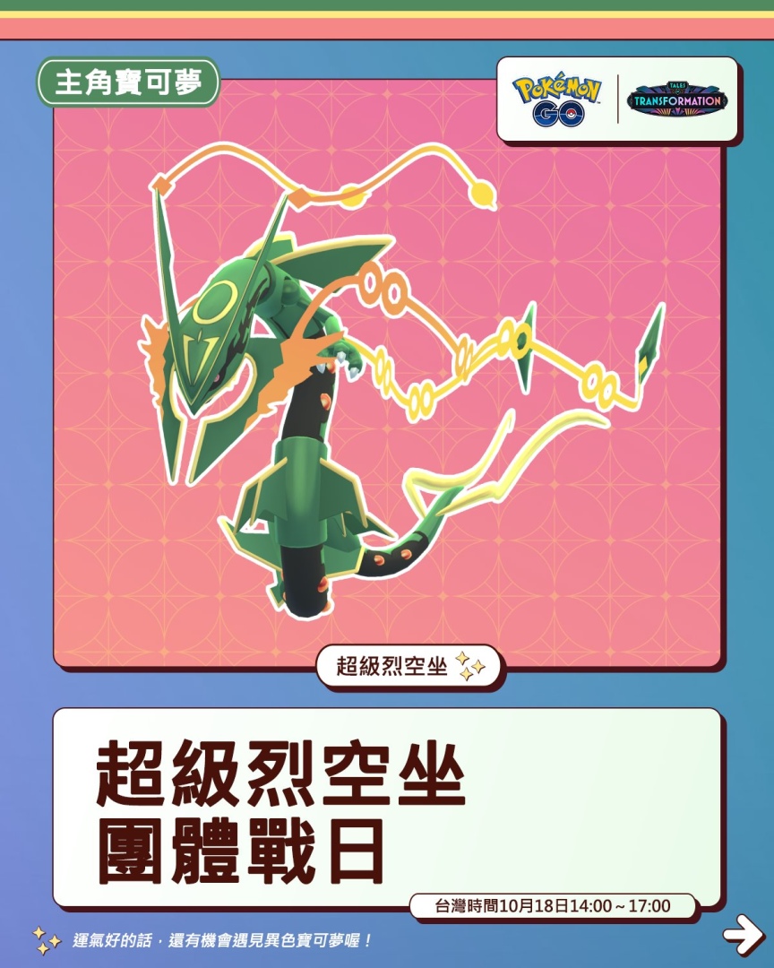 《Pokémon GO》繼今天的「超級巨金怪」團戰之後,如今再度宣佈,將於台灣時間 2025 年 10 月 18 日 14:00~17:00 推出「超級烈空坐」團體戰日讓訓練家們進行挑戰。