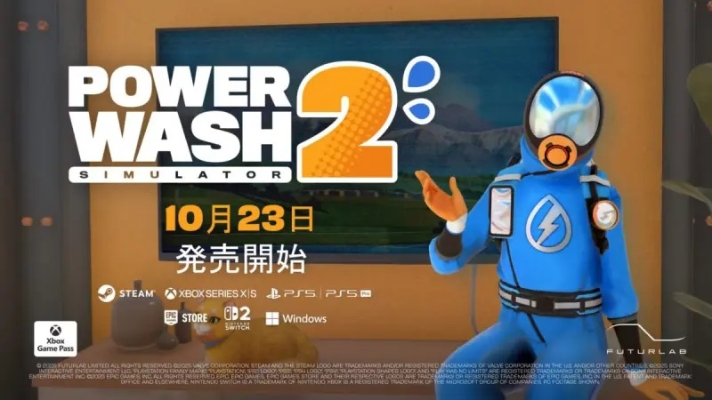 FuturLab 開發、預定 2025 年內在 PC(Steam/Epic Games Store/Microsoft Store)/PS5/Xbox Series X|S 等平台推出,並支援繁中等語系,目前也在 Steam 推出 demo 試玩的高壓洗淨模擬動作遊戲《PowerWash Simulator 水洗模擬器2》,宣布將自 2025 年 10 月 23 日起在各平台同步發售。