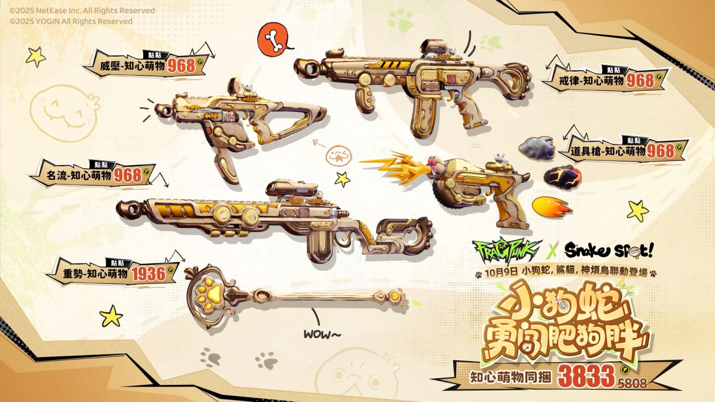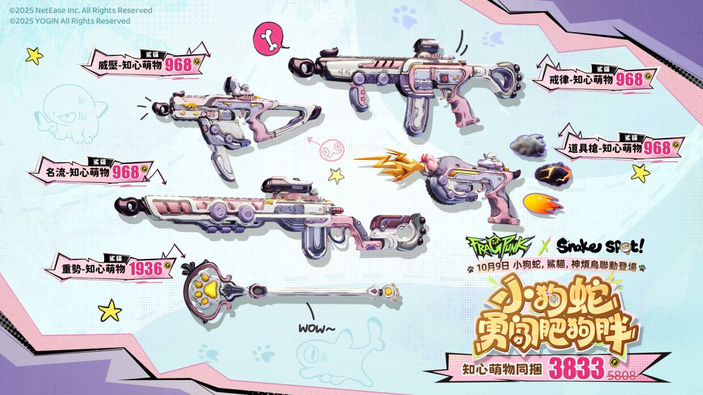《FragPunk》攜手人氣插畫 IP「小狗蛇 Snake Spot」,推出限定聯動系列。小狗蛇、鯊貓與神煩鳥三位人氣角巴登上界外戰場,本次聯動推出「戒律」、「威壓」、「名流」、「重勢」與「道具槍」等五款武器外觀,結合鮮明配色與角色元素點綴,為原本肅殺的戰場增添一抹可愛氣息。不過,千萬別被這份萌度迷惑~當小狗蛇與牠的快樂夥伴們現身時,隨之而來的將是致命級的可愛暴擊!