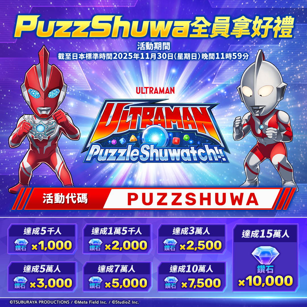 此外,依據該代碼的總輸入次數,還將追加全體報酬——額外鑽石獎勵。活動進度與獎勵達成情況,將透過官方X帳號不定期公告。歡迎把握機會,邀請親朋好友一同進入《超人力霸王拼圖Shuwatch!!》的世界!
