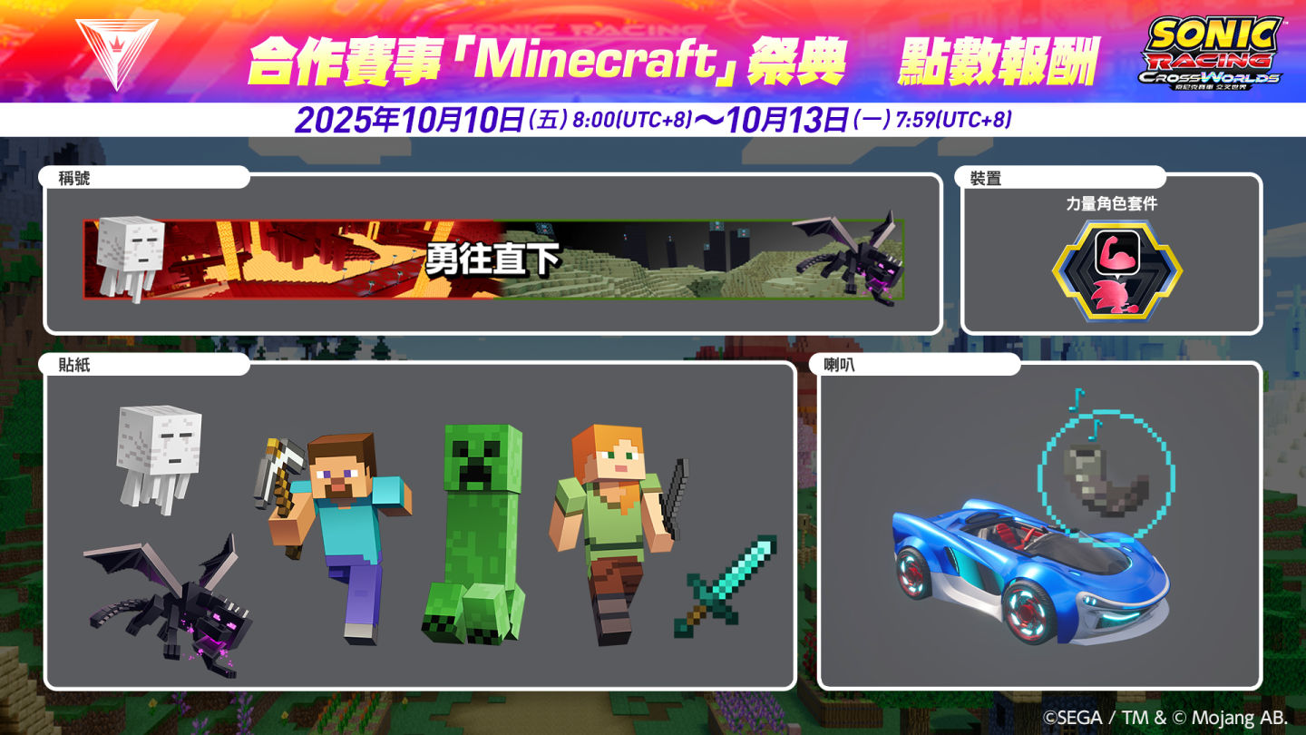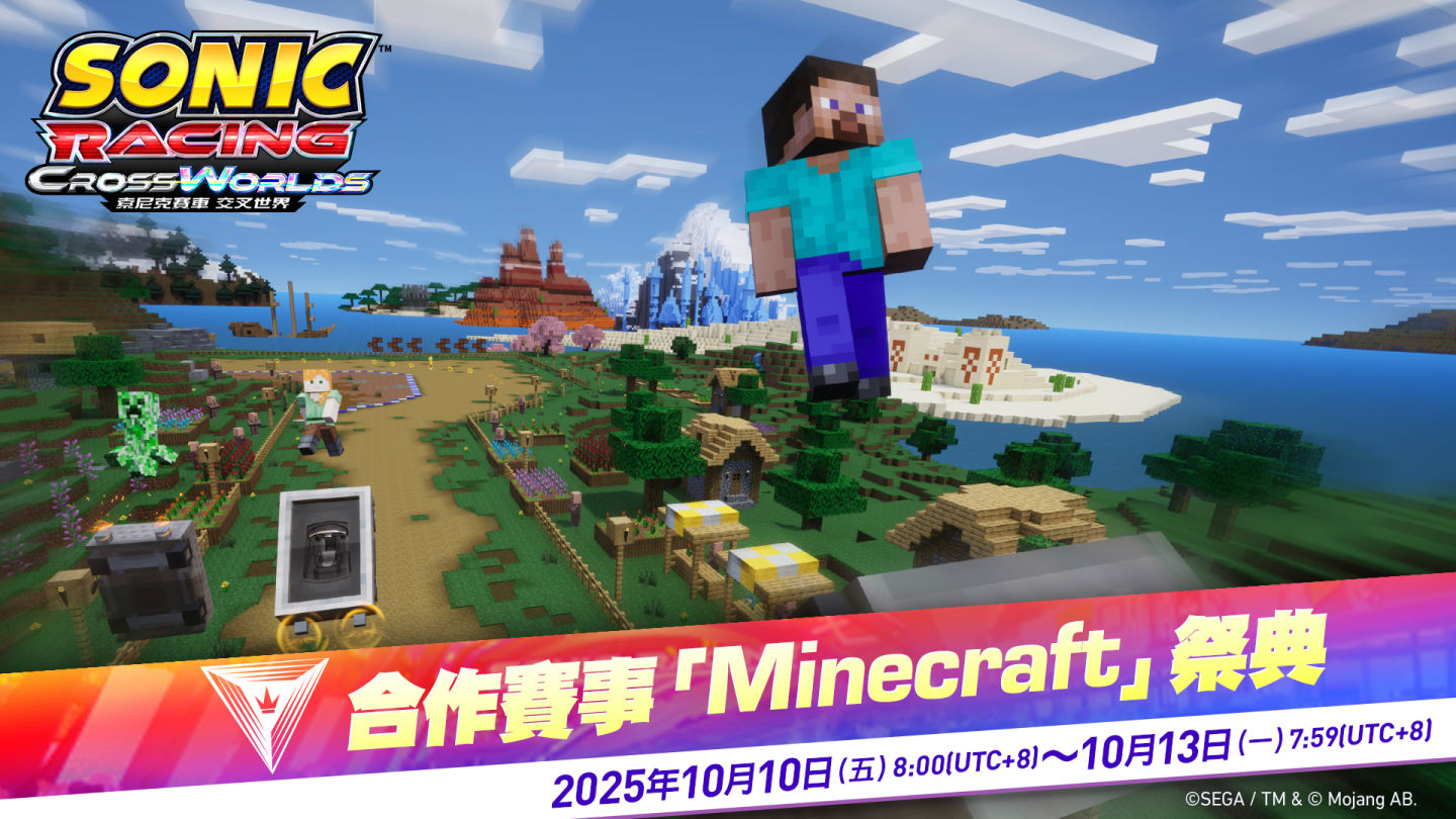 為紀念「Minecraft」DLC 發售,將於《索尼克賽車 交叉世界》遊戲內舉辦特別賽事。於賽事期間收集祭典點數,即可獲得特別報酬。