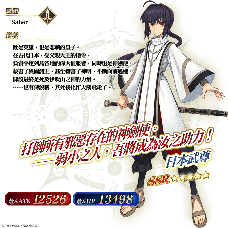 通關「特異點F 燃燒污染都市 冬木」的御主,可自即日起至 2025 年 10 月 23 日(四)12:59 期間,透過限時開放的「日本武尊」體驗任務,體驗從者的技能及寶具,通關後將獲得獎勵「呼符 1 張」。同期間,在「蒐集種火」及「打開寶物庫之門」中,「★5(SSR)日本武尊」將作為支援從者限時登場。
