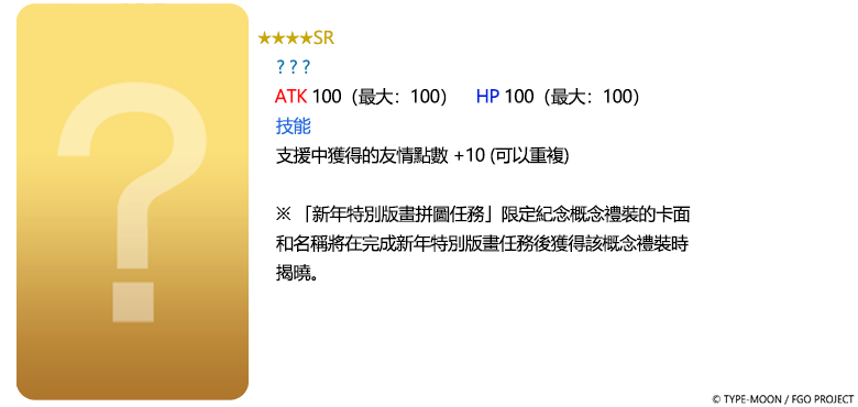 即日起至 2025 年 10 月 23 日(四)12:59 期間限時開啟的「新年特別版畫拼圖任務」,完成每日追加新的任務,可以打開對應拼圖並獲得獎勵,包含 2025 年新年紀念活動指令紋章「★3(R)膠囊 Saber 龍」、「傳承結晶」、「呼符」及概念禮裝 EXP 卡「★4(SR)御節料理雖好」等豪華獎勵;完成所有版畫拼圖任務後,還能再獲得「新年特別版畫拼圖任務」限定「★4(SR)紀念概念禮裝」。