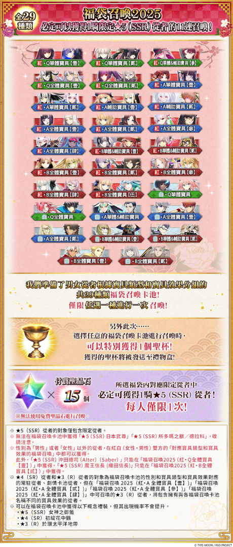 即日起至 2025 年 10 月 23 日(四)12:59 期間,在「2025 年新年福袋召喚(男女區別×寶具類型・效果區別)」中,是以男性及女性從者的各職階「寶具類型」及「寶具效果」分組,共分成 29 種福袋召喚卡池,使用 15 個付費聖晶石進行僅限 1 次召喚,必定獲得 1 騎限定 ★5(SSR)從者。