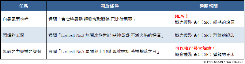 即日起,迦勒底之門將常駐追加「進階任務」第 17 彈,開放「向暴風雨咆哮」、「閃耀的王冠」及「無敵之力與神之智慧」三個任務,通關即可獲得對應的概念禮裝「★4(SR)緋毛的燎原」、「★4(SR)群雄的證印」、及「★4(SR)蠻龍的牙床」。此外,獲得 5 張「★4(SR)蠻龍的牙床」後,可以進行最大解放強化技能的效果。