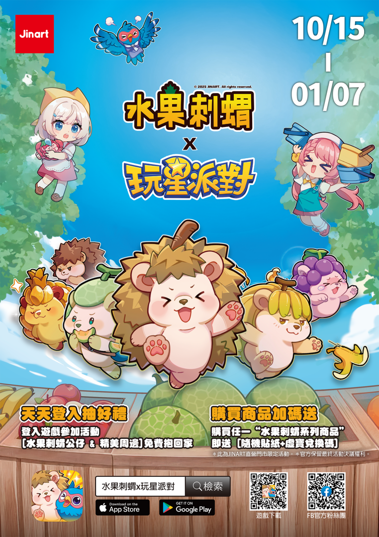 活動期間,玩家可透過遊玩累積點數,在《玩星派對》的兌換商店中換取限定實體公仔。除此之外,全台 JINART 實體直營店也將同步推出聯動活動——凡於活動期間購買任一「水果刺蝟」商品,單筆消費即可隨機獲得乙張限量「水果刺蝟」貼紙,內含《玩星派對》虛寶兌換碼!線上線下同步舉辦,讓玩家不只在遊戲中收集角色,還能帶著實體公仔一起回家!