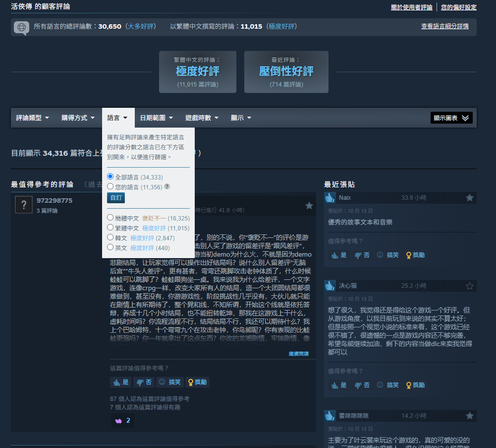 《活俠傳》於上市之初,即憑藉其獨特的武俠設定、擲骰系統與充滿爭議性的「醜俠」主角趙活,在 Steam 社群上迅速累積了大量人氣。當時社群討論的熱烈盛況到遊戲推出後即達到 Steam DB 所紀錄的 24278 人同上峰值,最終在 STEAM 全語言評論數達到 3 萬多評論數,其中繁體中文、韓文、英文呈現極度好評,而簡體中文則是褒貶不一,具有最多的評論數存在。