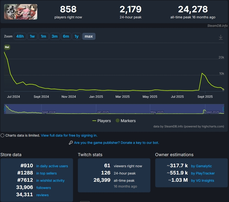 針對外界與社群持續關注的銷量表現,在 2024 年的新聞報導曾指出,為協助本土獨立開發商,數位發展部數位產業署推動「獨立遊戲開發獎勵計畫」與「產品化加值類別」等補助與輔導。據悉原始鳥熊開發的《活俠傳》在獲得輔導後成功上市,銷量已超過 20 萬套。如今開發團隊證實《活俠傳》已突破 30 萬份,顯見一年來的不斷更新累積下,加上葉雲裳線的大型更新內容,將遊戲推向 30 萬銷量的里程碑。