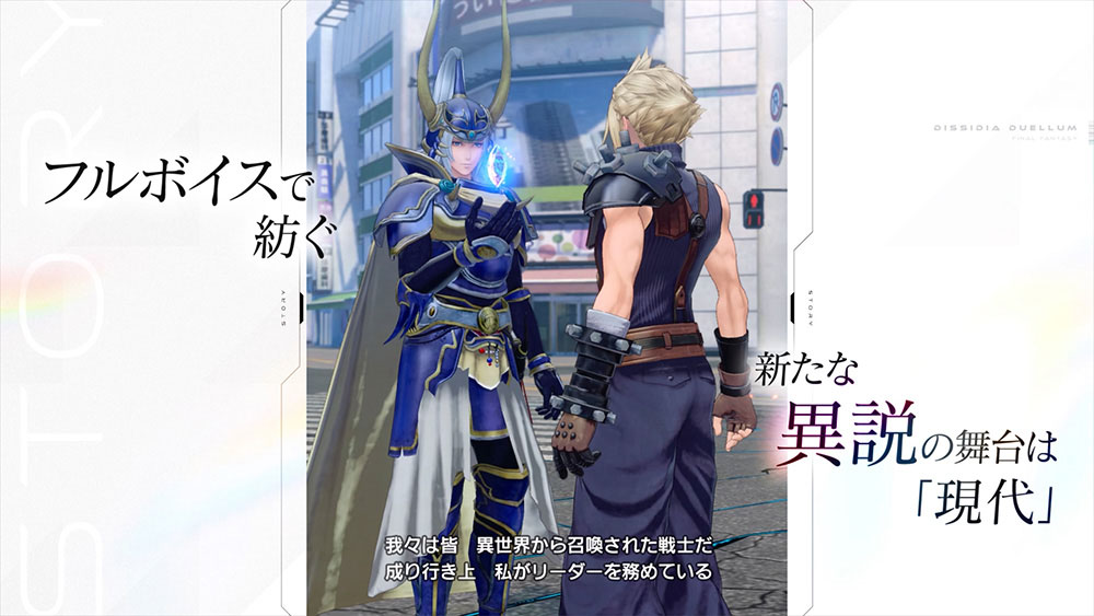 作為「紛爭」系列的一大特色,本作將延續跨越《Final Fantasy》系列作品藩籬的角色交流。預告片中已展示《Final Fantasy 14》的蓋亞與《Final Fantasy XIII》的雷光之間的對話場景,預期將會收錄更多作品間角色的互動小故事。本作主線故事將以全語音演出,額外收錄了能讓玩家一窺戰士們日常的短篇故事。