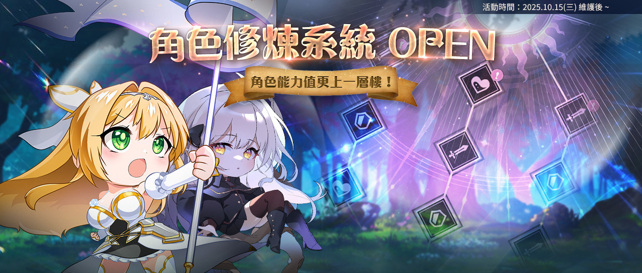 全新「角色修煉系統」開啟,只要角色等級達 100 以上即可於遊戲中「角色」→「修煉」中,使用所需財貨資源(靈魂、屬性石)即可進行角色修煉,提升角色能力值。