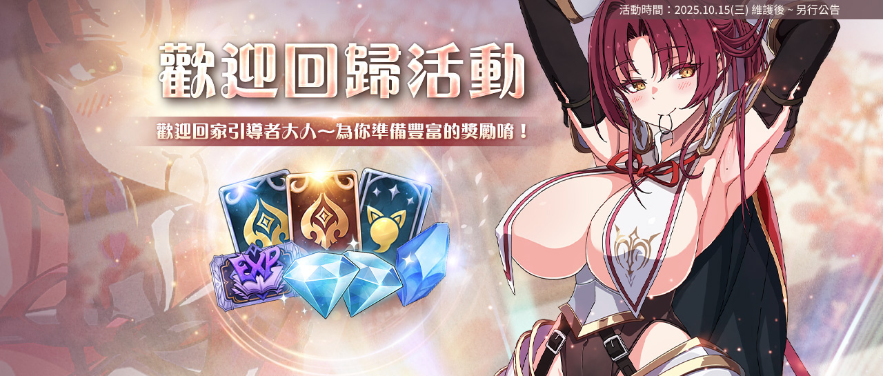 .歡迎回歸活動:10/15 維護後~另行公告,超過 14 天未登入遊戲的引導者,活動期間於遊戲中簽到七天即可獲得包含「鑽石×500、紫色票券×5、寵物召喚券×10、重鑄石×20、鑽石×500、角色召喚券×10、特選角色召喚券×10」等對應獎勵。
