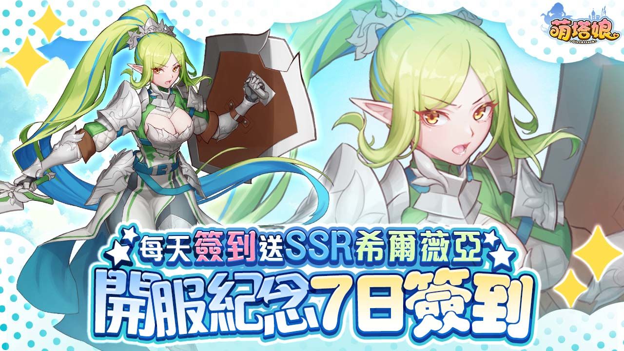 為慶祝正式上市,《萌塔娘》規劃了眾多開服活動,首波公開「開服紀念 7 日簽到」活動:活動期間內只要每日登入遊戲即可獲得豐富獎勵,簽到滿七天即可帶走 SSR 塔娘「希爾薇亞」與高達 280 抽的「塔娘召喚券」!希爾薇亞是來自藏紅花公國的精靈族塔娘,她以劍和盾守護著團隊,能使用技能「世界樹的庇護」減少友方所受傷害,是前線中最可靠的夥伴!