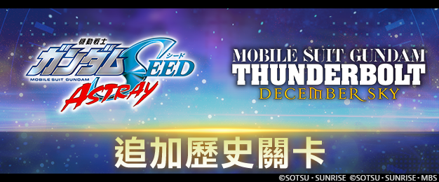 「歷史關卡」已於 10 月 16 日實裝,玩家可在此遊玩以往登場的故事事件。首波由《機動戰士鋼彈SEED ASTRAY》和《機動戰士鋼彈 雷霆宙域DECEMBER SKY》兩部作品打頭陣,請務必前往挑戰!