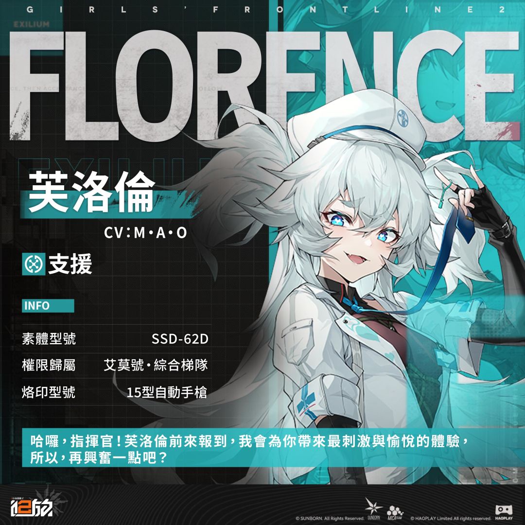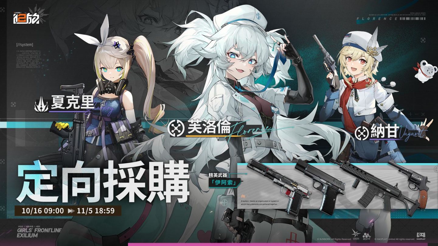 在定向採購及軍備提升中,人形「芙洛倫」、以及「夏克里」、「納甘」與精英武器「伊阿索」的獲取機率限時提高。芙洛倫被描述為性格坦率且擅長引誘,兼備高超的醫療技術和對藥劑的熱忱。