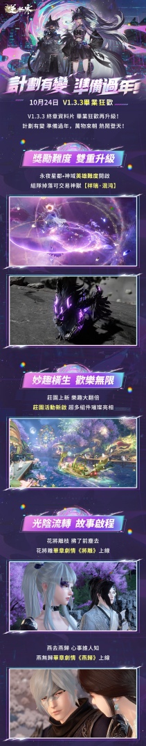 10 月 24 日,V1.3.3 終章壓軸來報到,萬物齊賀最閃耀!《逆水寒》首賽年即將圓滿落幕,但江湖永不止步,2.0 新紀元啟航在即,後續將釋出新賽年驚喜內容預告,敬請鎖定官方平台。