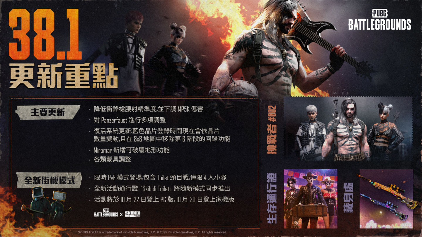 此外,為慶祝萬聖節,《PUBG》也將推出與全球超人氣 YouTube 動畫 IP《Skibidi Toilet》的限時合作街機模式。該模式為 PvE 首領戰,玩家將組成四人小隊對抗強大的 Toilet 首領。比賽結束後可獲得「化學罐」,並於下一場戰鬥中升級武器與裝備。隨著合作模式同步上線,官方也將推出全新活動通行證:Skibidi Toilet。