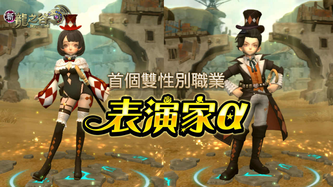 「表演家α」是《新龍之谷》中首款可自由選擇性別的職業,主武器為「閃耀魔杖」,副武器為「派對包」,能釋放「雜耍」、「光彩彈跳」等炫目技能。進階轉職後,一轉「舞台藝術家」及二轉「卡牌戲法師」將能施展「氣球漂浮」升空、「榔頭砰砰」猛擊,甚至召喚超大旋轉木馬席捲戰場,將戰鬥轉化為一場魔幻舞台秀。