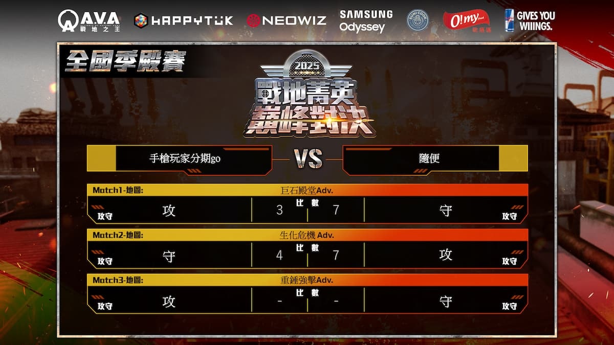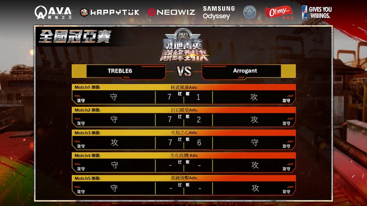 儘管連失兩局,「Arrogant?」在第三張地圖「火鳥之心Adv.」中爆發出驚人的求生意志,使得戰況一度膠著,不過賽局末盤「TREBLE6」仍憑藉更老道經驗和精準的殘局處理,最終在緊張萬分的賽點局中,以一分之差險勝對手,成功完成 3:0 的絕對性橫掃,不僅抱走了賽事最高 110,000 元冠軍獎金及冠軍獎盃,更正式寫下了四連冠的《A.V.A 戰地之王》新紀錄!