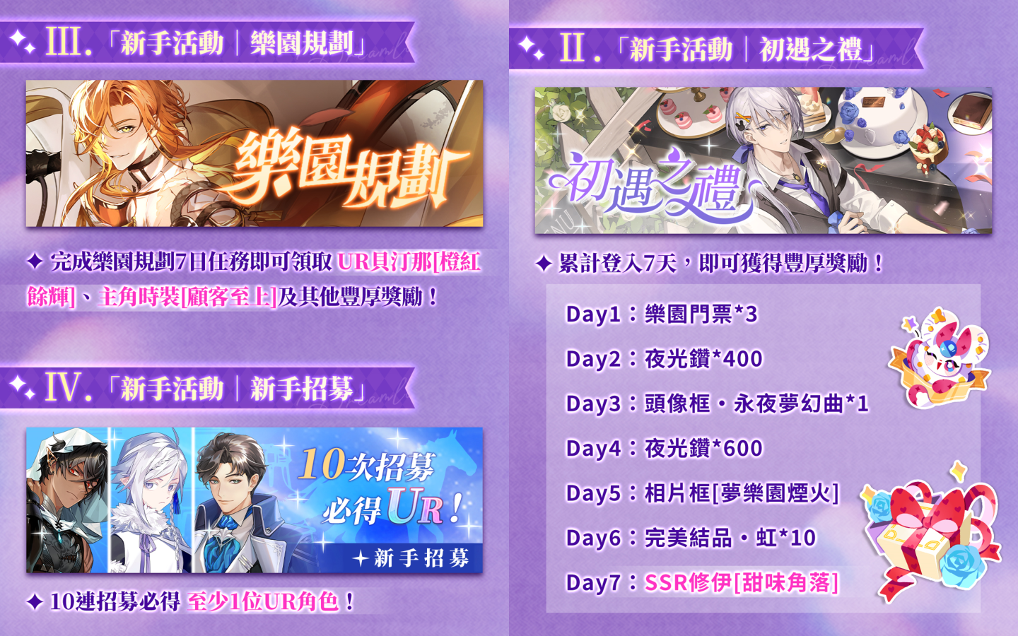 ▪️「累積 7 日登入」,可獲得 SSR 修伊[甜味角落]、大量夜光鑽、頭像框、樂園門票......以及眾多豪華資源
