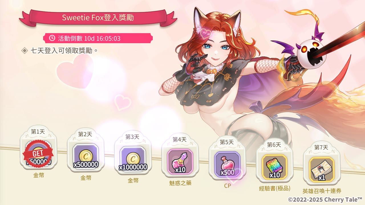 活動期間內,只要連續登入七天即可獲得豐厚獎勵,包含轉蛋召喚券、CP 與魅惑之藥等,幫助玩家加速攻略 Sweetie Fox,解鎖私密劇情。