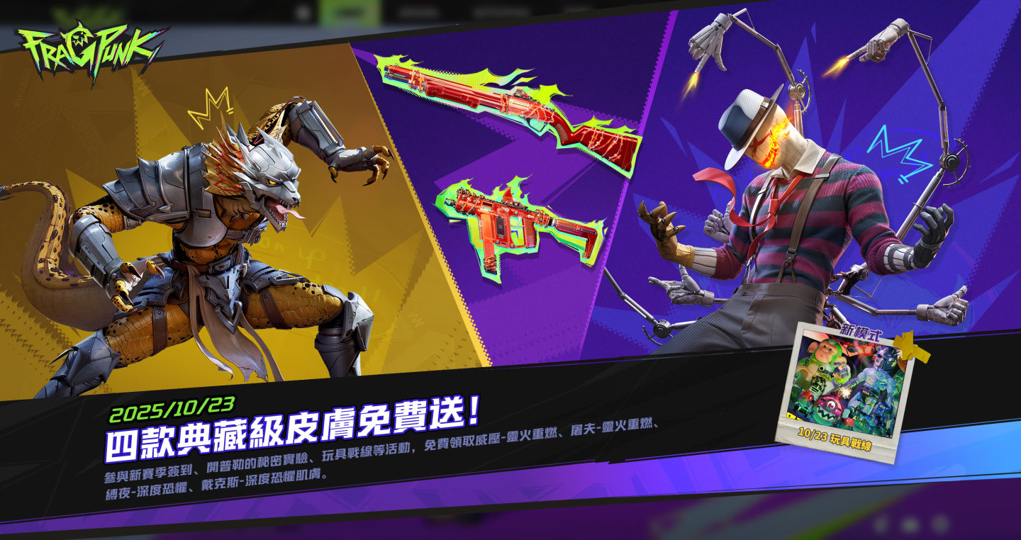 艾肯娛樂代理的新世代 FPS《FragPunk 界外狂潮》今(23)日推出萬聖節限定版本!本次改版帶來全新 PVE 模式「玩具戰線」與萬聖節限定碎片卡,玩家將組成三人小隊在界外戰場迎戰叛變玩具軍團,展開刺激又惡搞的防線之戰。