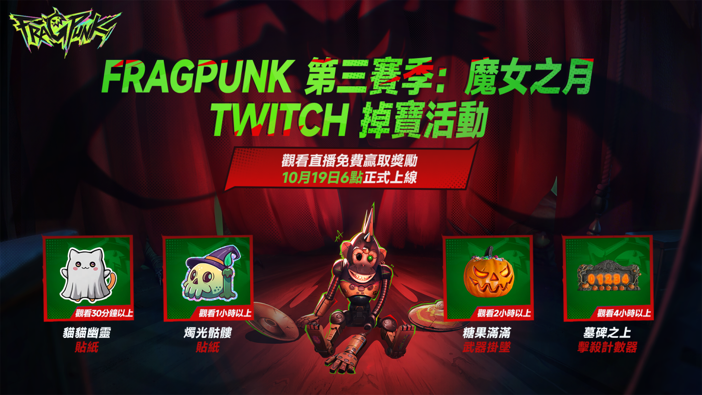 此外,為響應第三賽季「魔女之夜」主題,《FragPunk》同步開啟 Twitch 掉寶活動。玩家只要於活動期間在 Twitch 平台觀看指定頻道直播並累積達到指定時數,即可獲得萬聖節限定主題虛寶獎勵。本次掉寶獎勵內容包括:貼紙「貓貓幽靈」、貼紙「燭光骷顱」、武器掛墜「糖果滿滿」以及擊殺計數器「墓碑之上」。