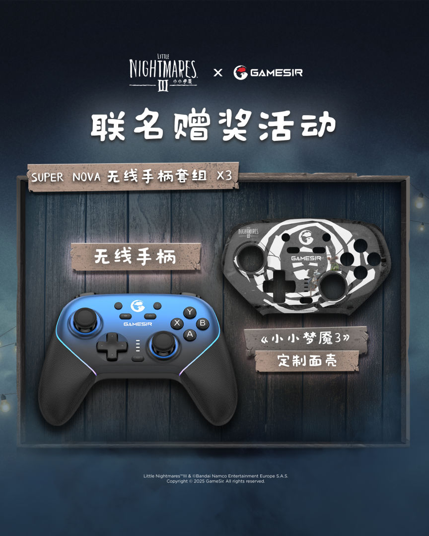 即日起至 2025 年 11 月 13 日(四)12:00(UTC+8)為止,玩家只要前往萬代南夢宮娛樂粉絲專頁,完成以下任務,就有機會獲得 GameSir 的 Super Nova 控制器,和以《小小夢魘3》的主角「小洛」與「小寂」為主題設計的限定聯名定製面殼。