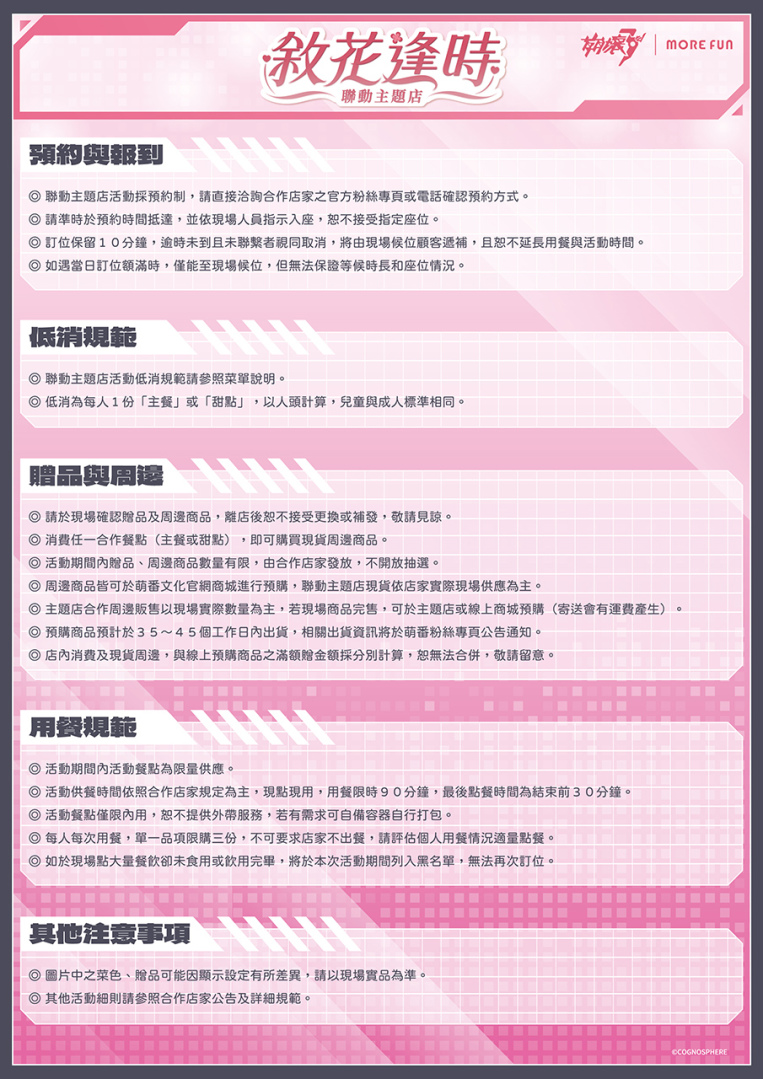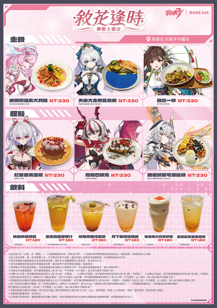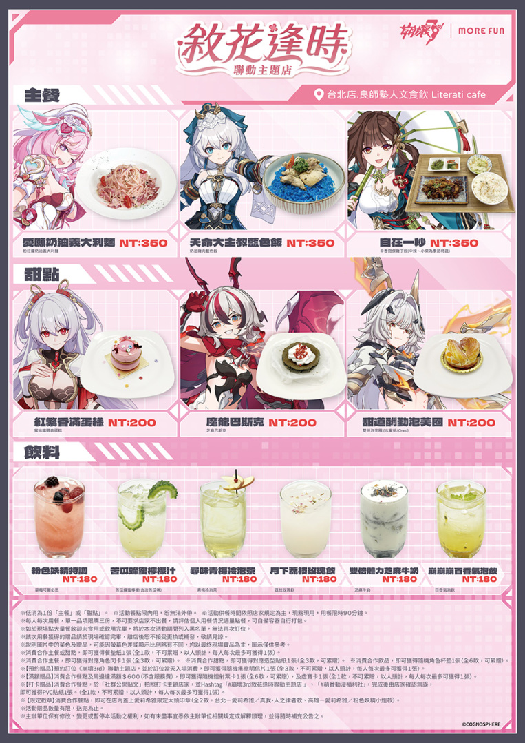 艦長們可在舒適雅緻的主題店氛圍中,品嚐以角色為靈感設計的限定餐點與飲品,感受《崩壞3rd》獨有的世界觀魅力。現場還有多樣化的活動等待艦長來參與,凡於活動期間消費指定餐點,即可獲得贈品;來店打卡還可獲得特典,讓艦長們在享用合作餐點的同時,盡情體驗別具特色的「崩壞食光」。
