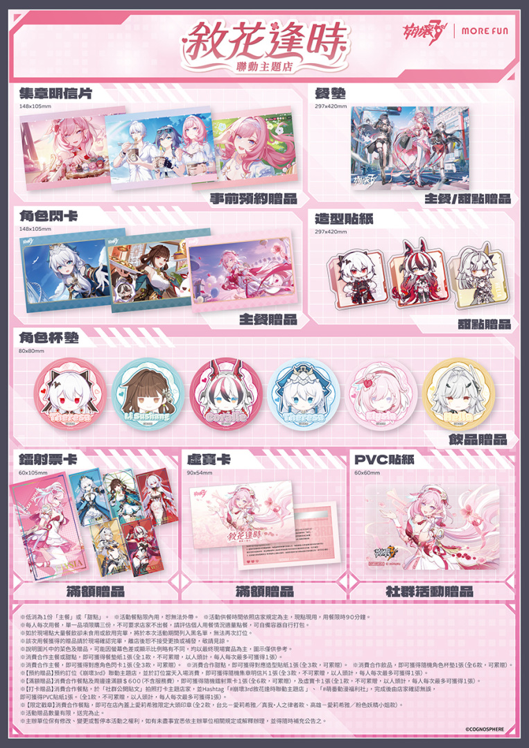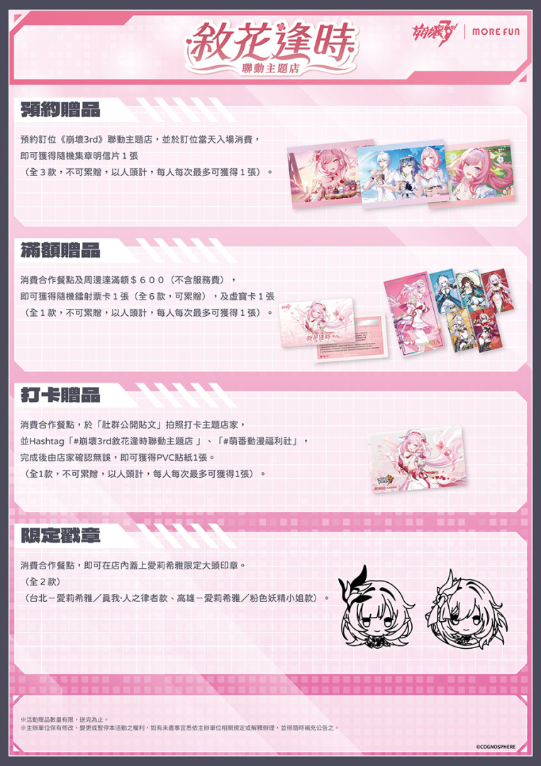 艦長們凡於主題店享用合作餐點,即可獲得多項《崩壞3rd》專屬特典贈品,預約入場的艦長們,可再獲得隨機明信片乙張,台北與高雄店更設有樣式不同的「愛莉希雅限定戳章」等待艦長們前來蒐集!活動詳情如下: