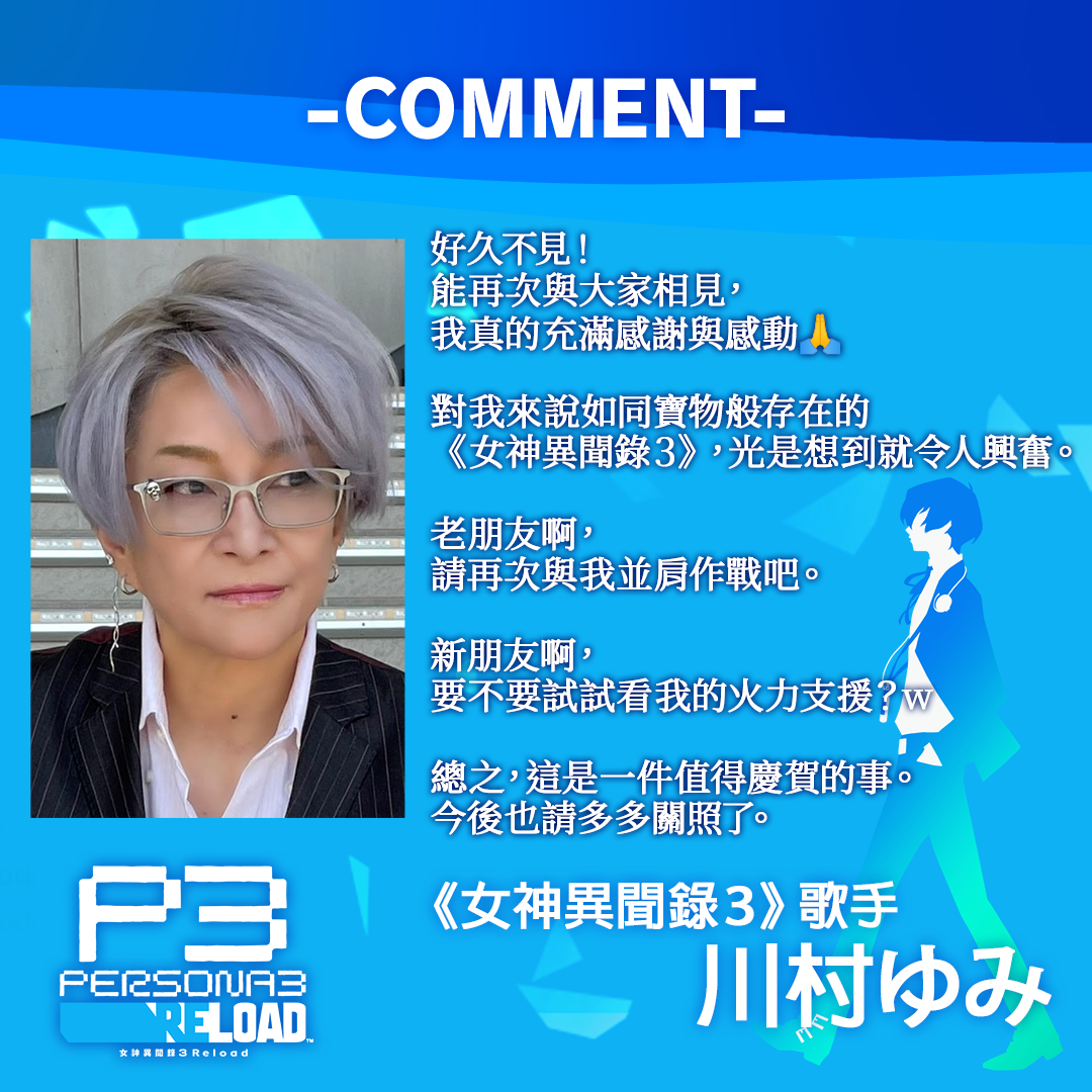 此外,今日也針對所有遊戲平台(Xbox/PS5/PS4/Steam/Nintendo Switch 2)發布了更新資料,內含原版《女神異聞錄3》歌手・川村ゆみ所演唱的 8 首《女神異聞錄3》與《女神異聞錄3 FES》樂曲。可喚醒遊玩《女神異聞錄3》那分感動的名曲,現在可以作為《女神異聞錄3 Reload》的迷宮與戰鬥 BGM 供玩家們盡情享受。