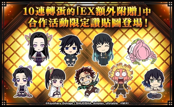 同時,以 10 連轉蛋抽轉蛋「超獸神祭×鬼滅之刃」時,可從作為「EX 額外附贈」出現的 9 種「合作活動限定讚貼圖」中,隨機獲得 1 種!