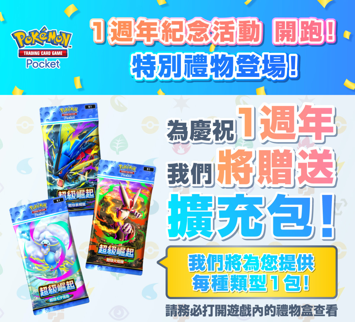 ・1 週年紀念活動:為慶祝 1 週年,將贈送擴充包「超級崛起 超級暴鯉龍」、「超級崛起 超級火焰雞」、「超級崛起 超級七夕青⿃」,每種各 1 包。