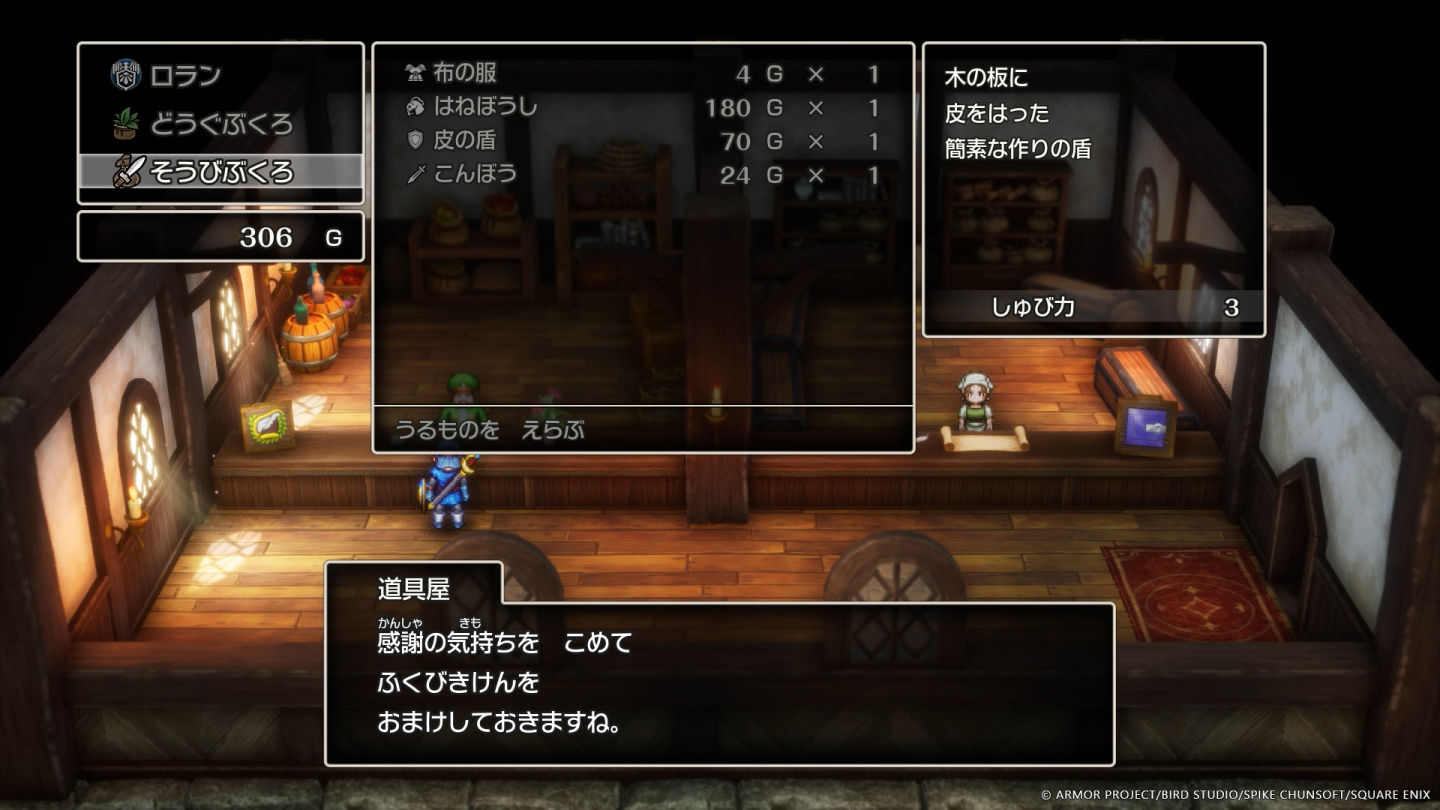 開始冒險前先做好萬全準備吧!國王會給主角旅途中用得上的道具和金幣。用獲得的金幣,購買道具和裝備吧!不要忘記裝備需要穿戴到身上喔!