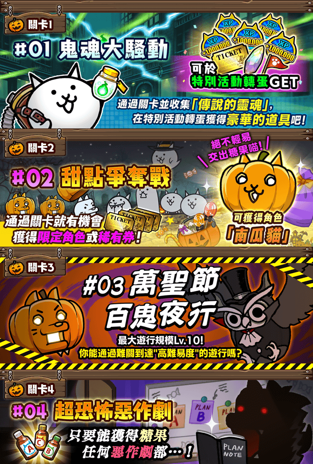 遊戲中會出現萬聖節期間限定關卡。只要通過「#01 鬼魂大騷動」就有機會獲得「傳說的靈魂」,可以用來轉期間限定的特別活動轉蛋「萬聖節派對」!多多收集「傳說的靈魂」來取得豪華道具吧!通過「#02 甜點爭奪戰」則有一定機率可以獲得限定角色「南瓜貓」!活動期間還會有其他限定關卡陸續登場!把握機會努力通關,同時享受遊戲中的萬聖節氣氛吧!