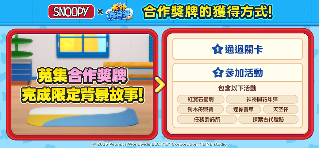 活動期間內只要通過一般關卡或完成各種活動,就有機會從活動獎勵中獲得合作獎牌。可以在裝飾商店內使用合作獎牌交換來獲得各個可愛的合作角色。快來蒐集所有合作角色裝飾(共8種),完成合作限定的背景故事吧!