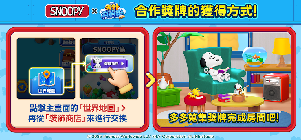前往「SNOOPY」島入手合作裝飾吧!運用合作獎牌就能獲得可愛角色並完成限定背景故事