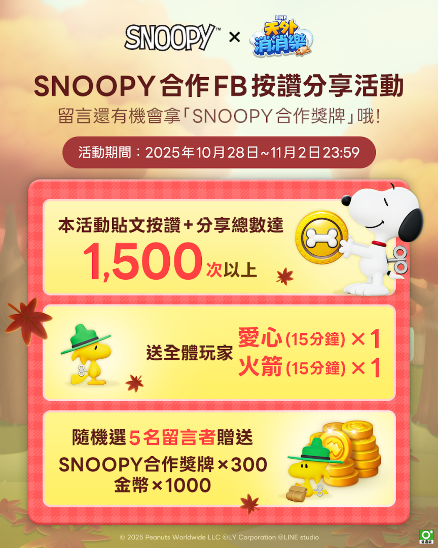若玩家參與「公開分享貼文」並於貼文下方「留言寫下對 SNOOPY 或天外消消樂應援訊息」,還有機會再獲得「SNOOPY 合作獎牌×300」以及「金幣×1,000」的幸運獎勵!把握機會快來參加吧!