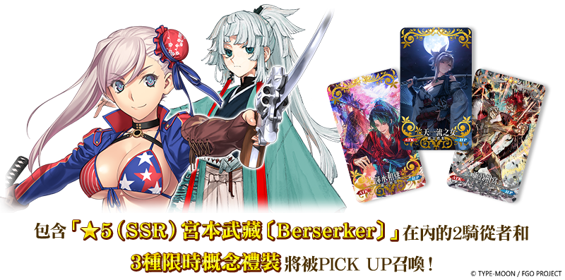 自 2025 年 11 月 5 日(三)16:00 至 2025 年 11 月 18 日(二)12:59 期間,將登場包含限定從者「★5(SSR)宮本武藏〔Berserker〕」在內的 2 騎從者,3 種限時概念禮裝「★5(SSR)二天一流之女」、「★4(SR)萍水相逢」及「★3(R)旗鼓相當」的卡池開放。