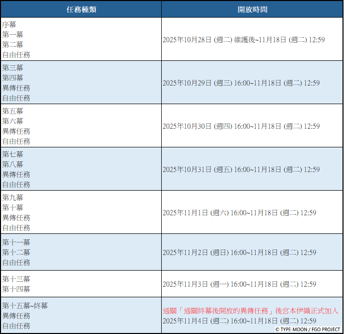 自 2025 年 11 月 5 日(三)16:00 後起,迦勒底之門將常駐追加強化「★5(SSR)宮本武藏〔Berserker〕」的特別任務「從者強化任務」,通關任務後不僅可以強化對象從者,更能獲得聖晶石獎勵。